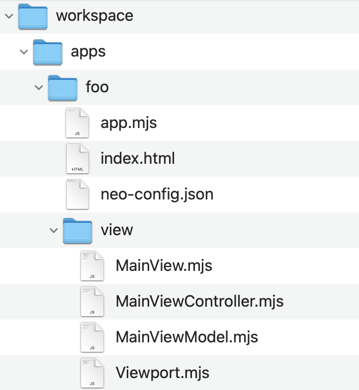 These files are part of the typical structure of a Neo.mjs application. The files index.html, app.mjs, neo-config.json, view/Viewport.mjs are rarely modified.